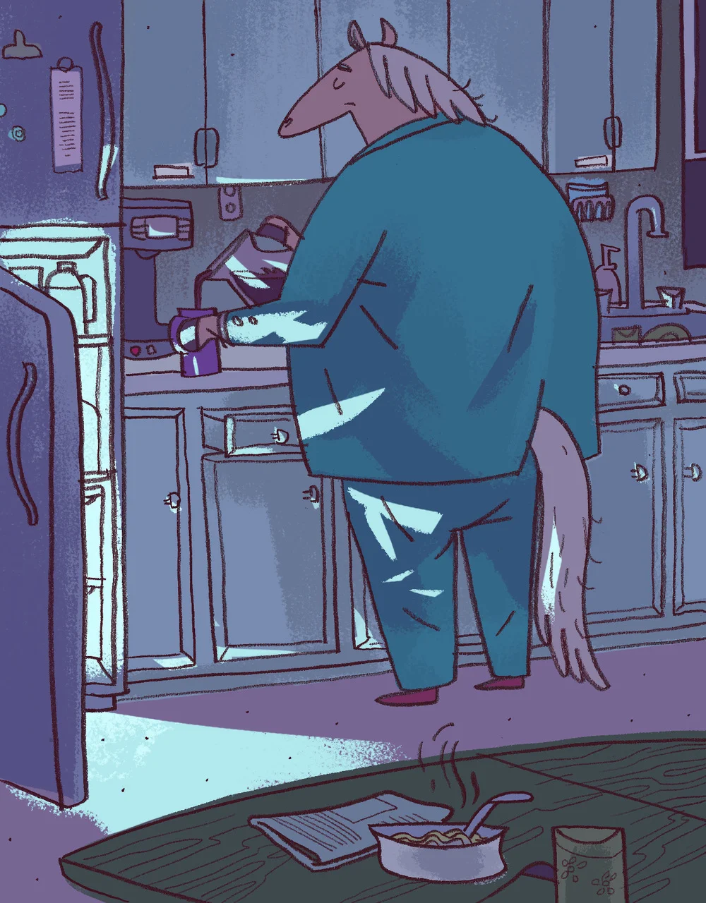 IS MR. HORSE WORKING LATE AGAIN? OR GOING INTO WORK EARLY? IT DOESN'T MATTER, HE CAN'T REMEMBER EITHER.